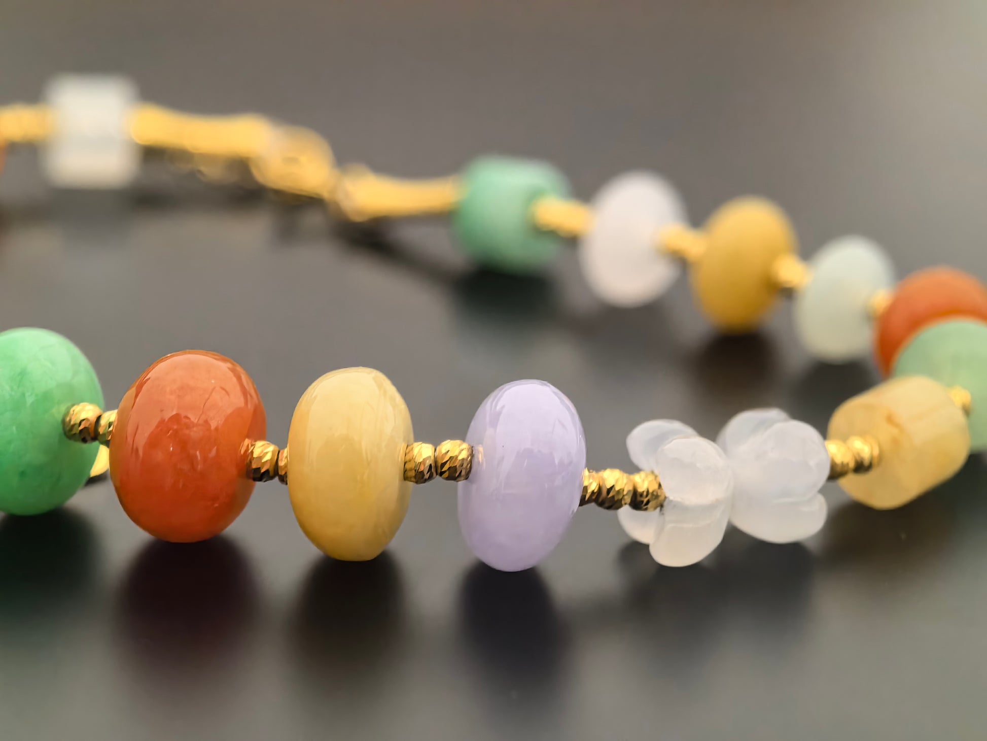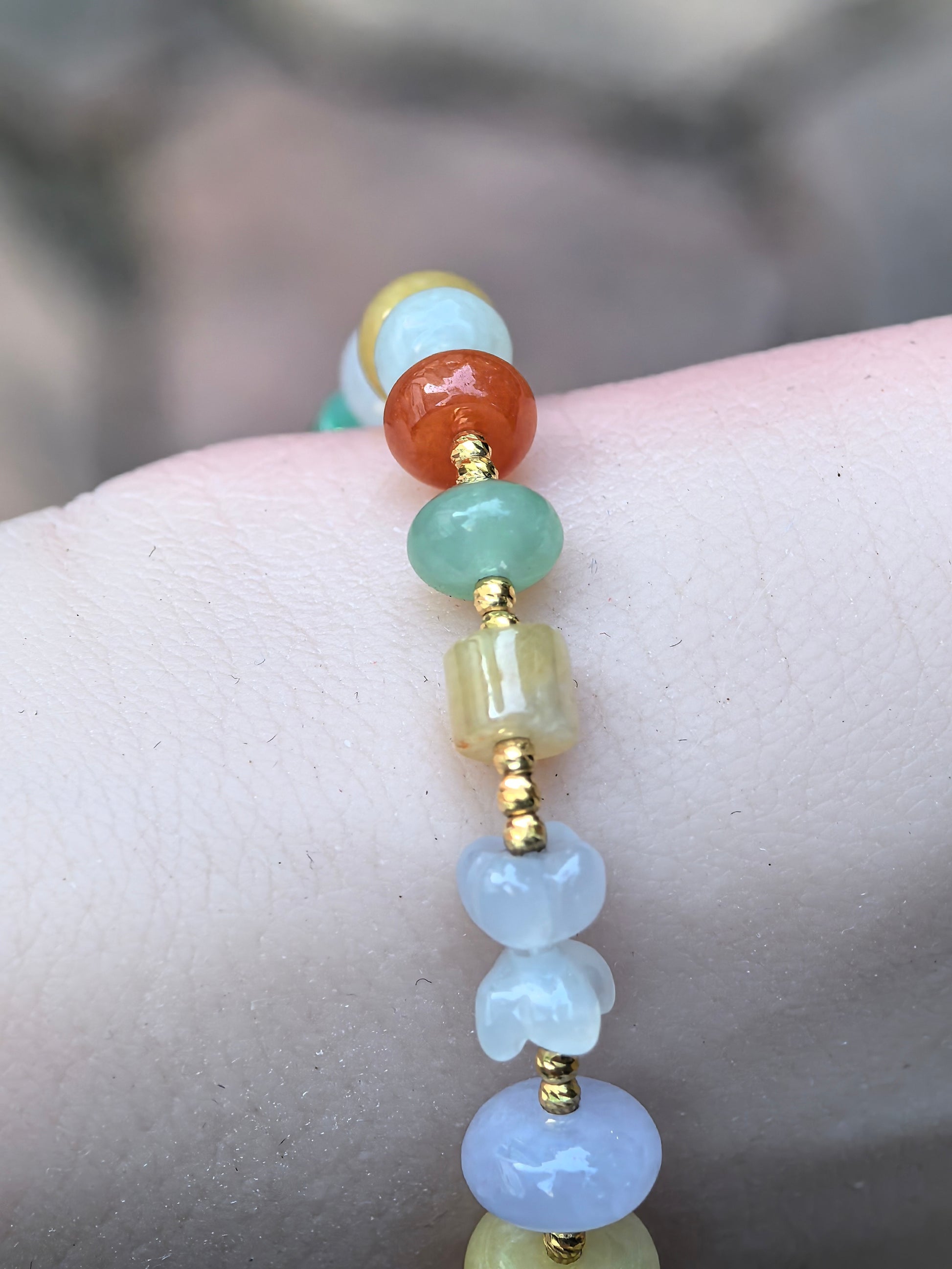 This multicolor jadeite bead bracelet is strung with small barrel and carved beads in soft lavender, fresh green, honey yellow and warm orange tones, spaced with 18K gold findings. The colors are lively but not harsh, so it works well as a daily piece that adds a bit of luck and brightness to the wrist.