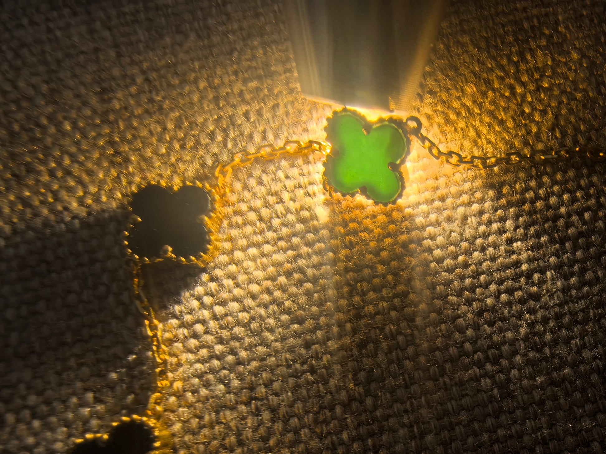 - Clover-shaped ink jadeite stations in an 18K gold bezel setting