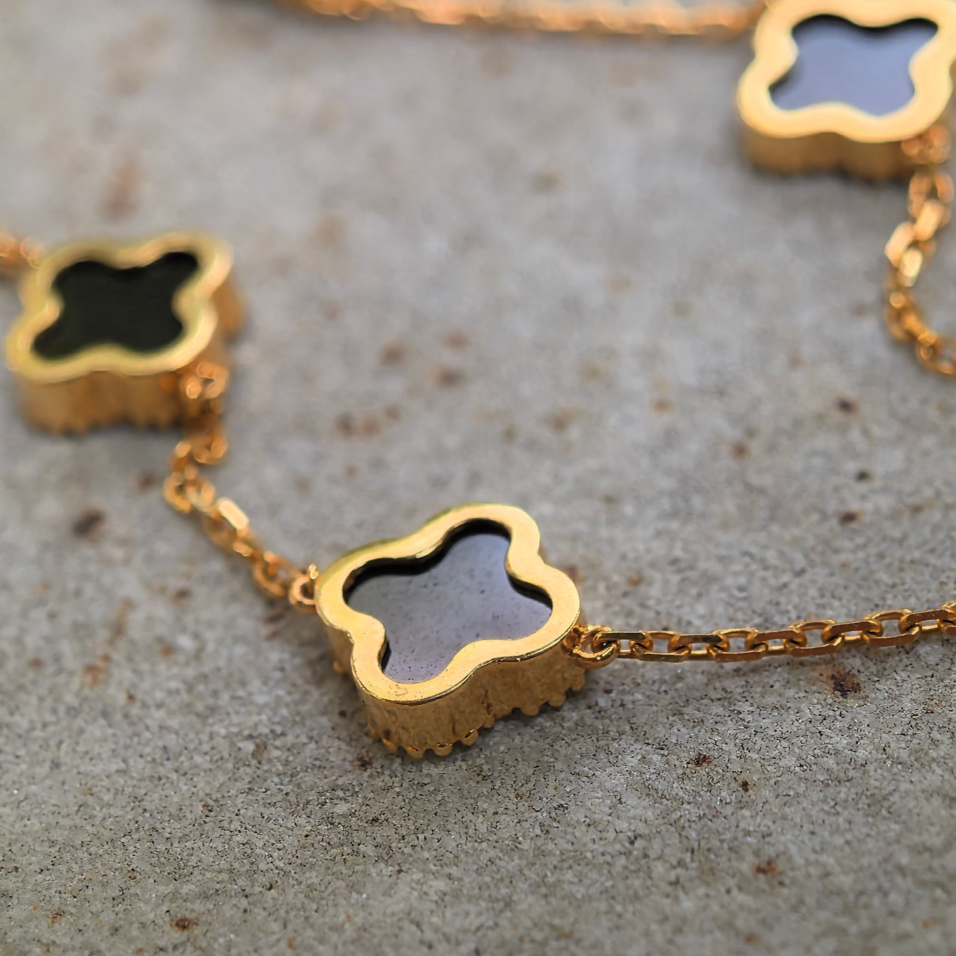 Each clover is neatly framed and linked as a station-style bracelet, so it layers easily with daily jewelry while still looking polished on its own. The overall feel is refined and wearable—minimal, elegant, and easy to match with both casual outfits and dressed-up looks.