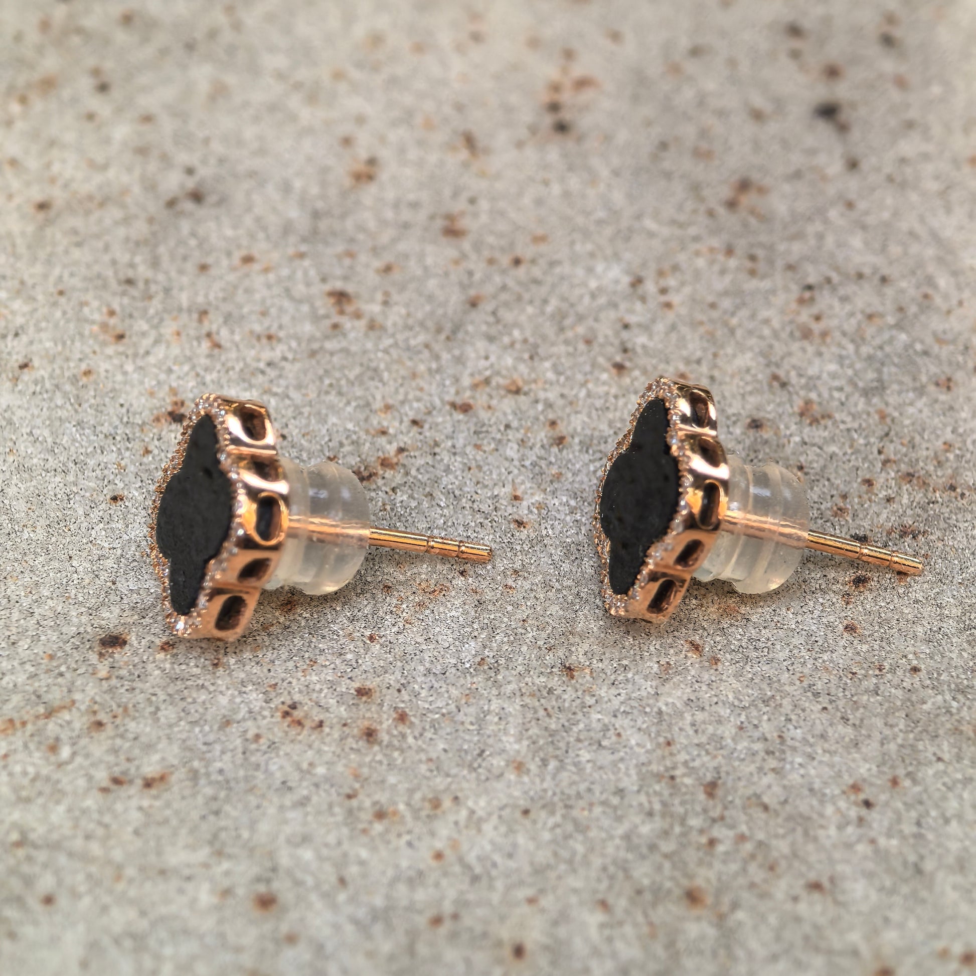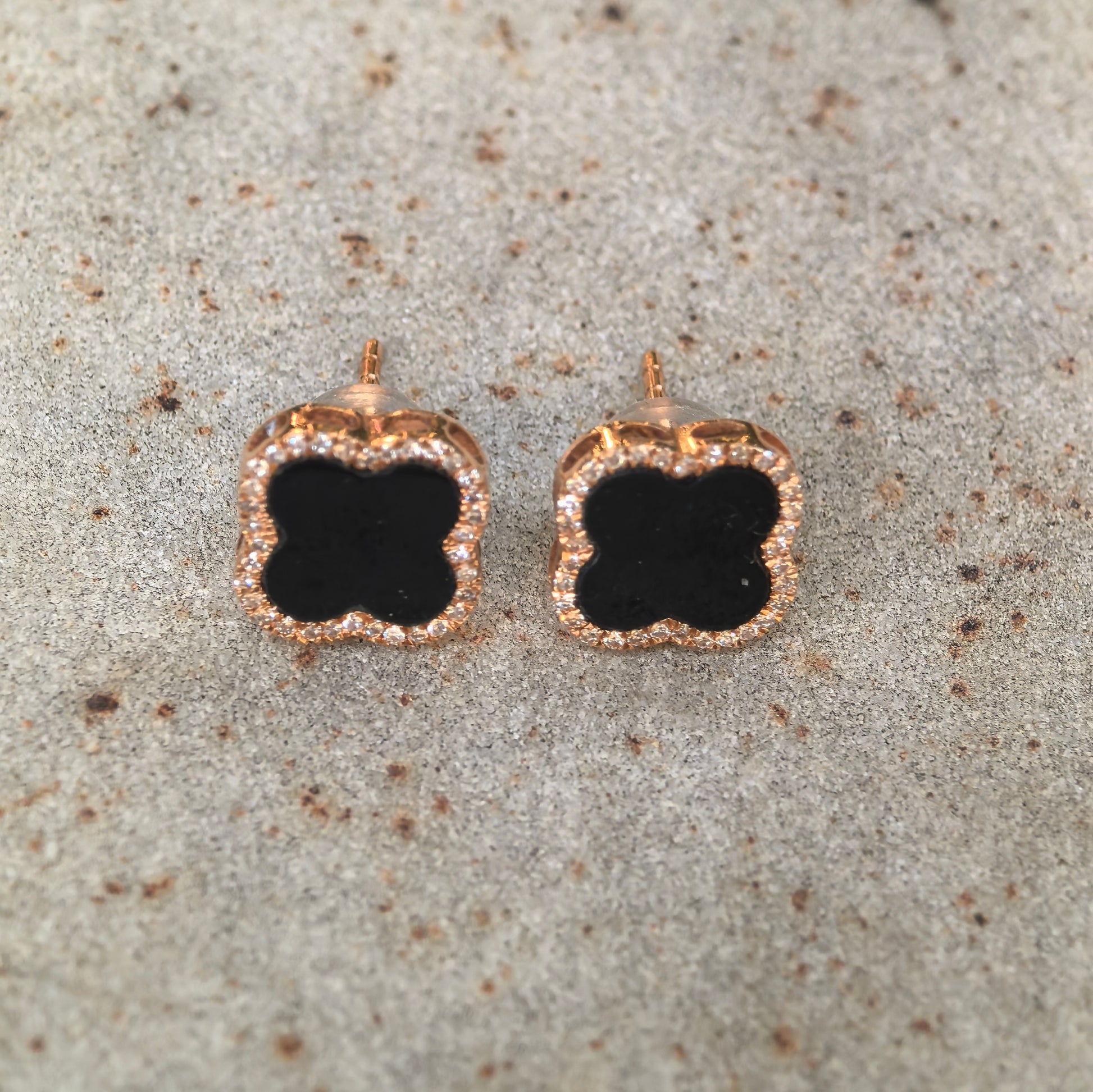- Clover-motif stud earrings with a smooth, polished profile and a diamond halo frame for a balanced, wearable look