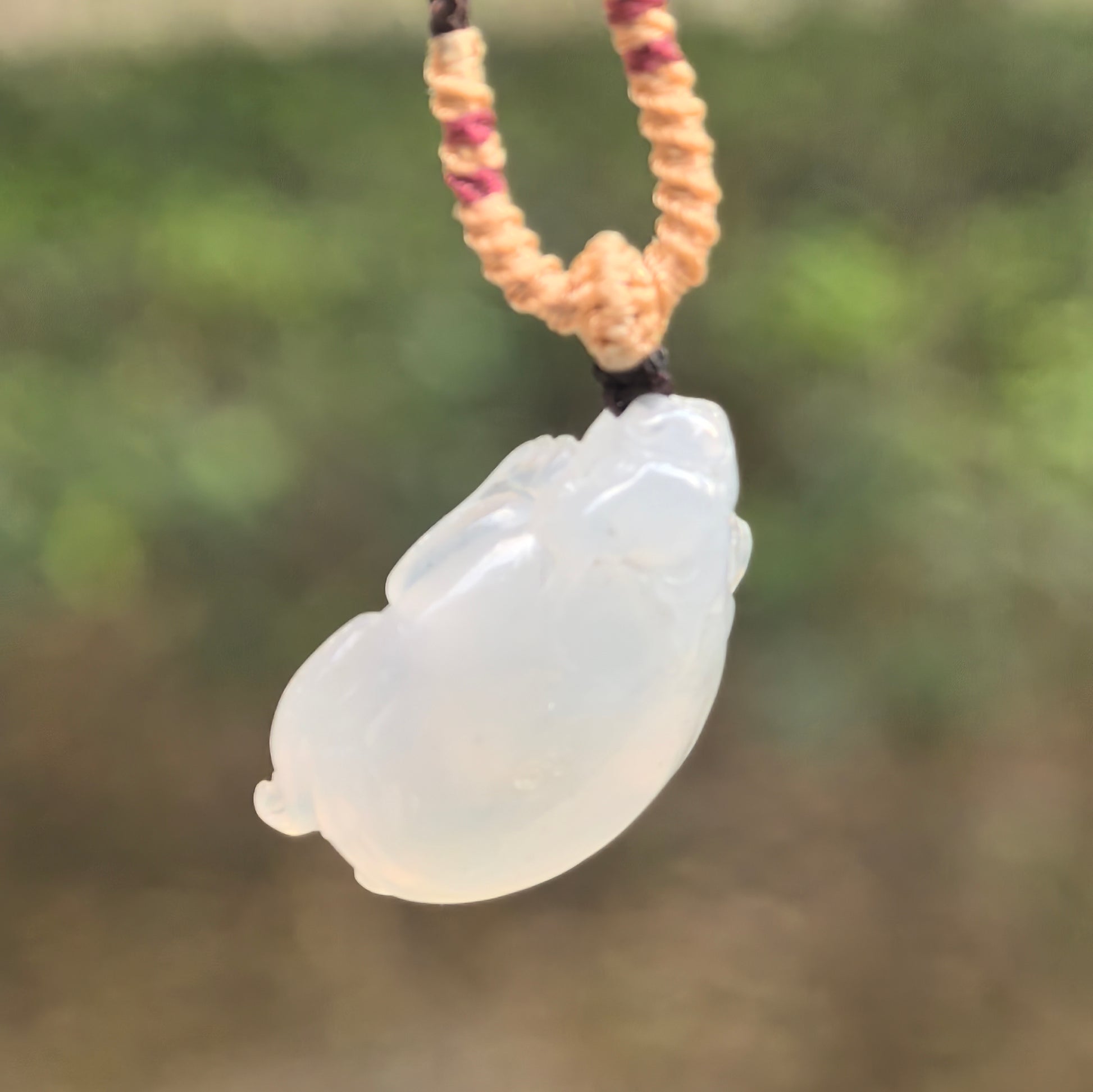 This pendant features an icy translucent jadeite dragon turtle carving with a clean, even body and a smooth, jelly-like glow. The colour reads soft and cool-toned under natural light, looking fresh and understated rather than overly “flashy.”