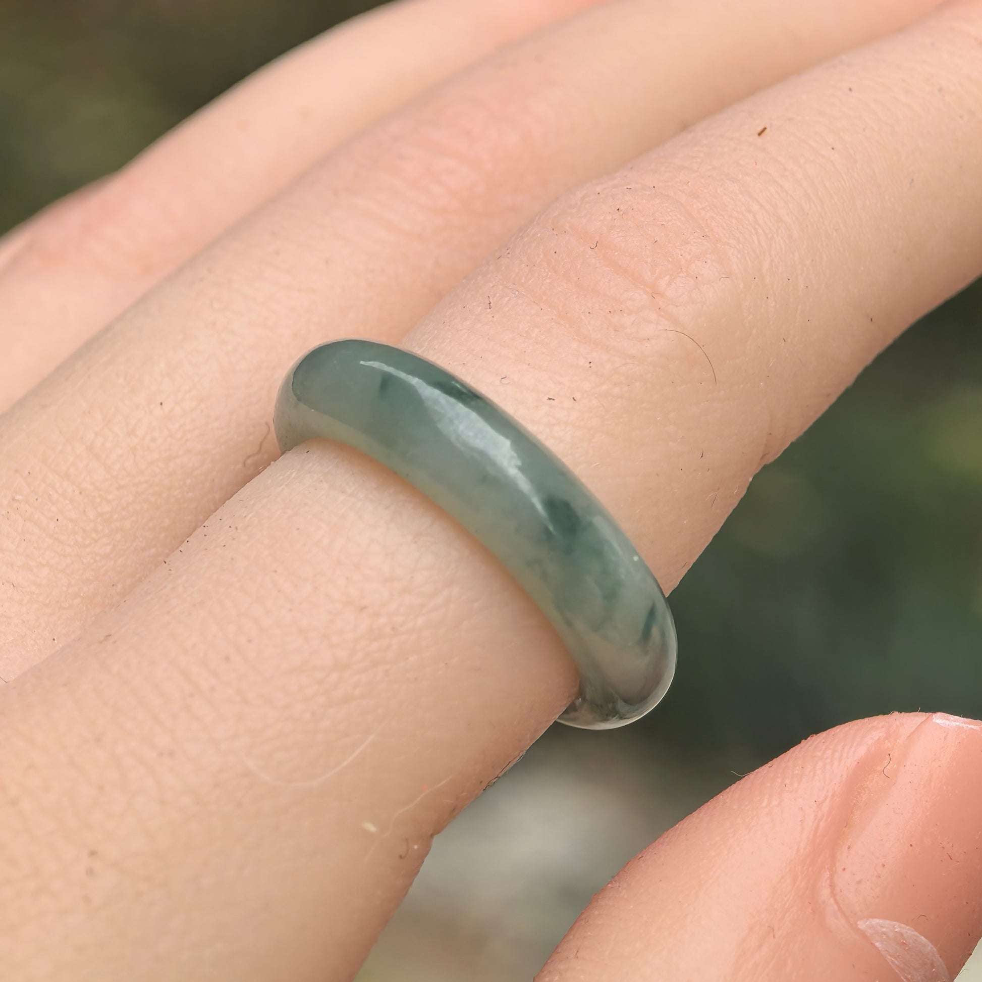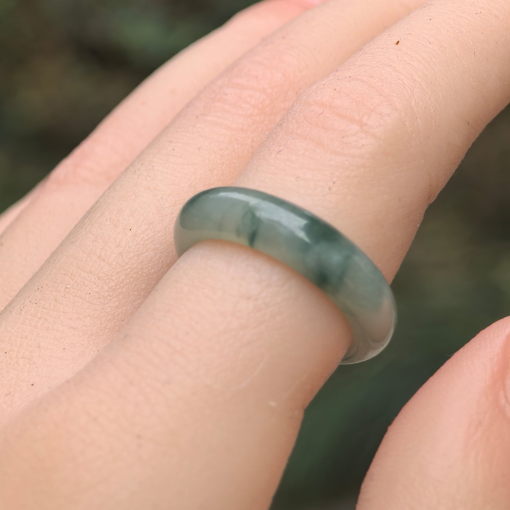 This jadeite ring collection features fine glutinous jadeite bands with a soft translucent texture and natural deep green mottling (known as floating green).