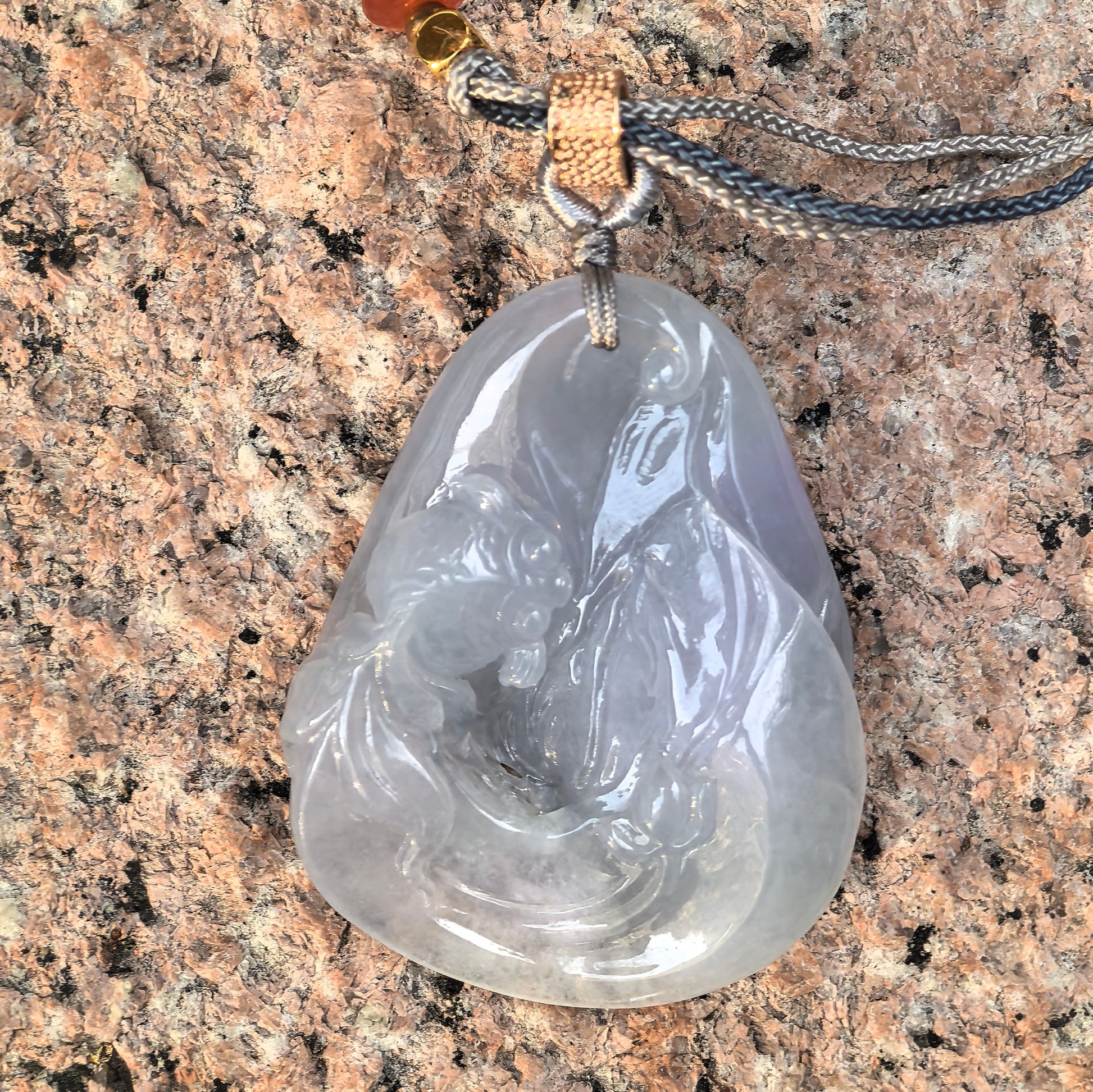 This pendant is carved in a graceful lotus-and-fish motif, featuring a glutinous-icy texture with a clean, watery “gel-like” glow. The base tone is soft and elegant, with a gentle hint of lavender that appears under light rather than looking overly saturated.