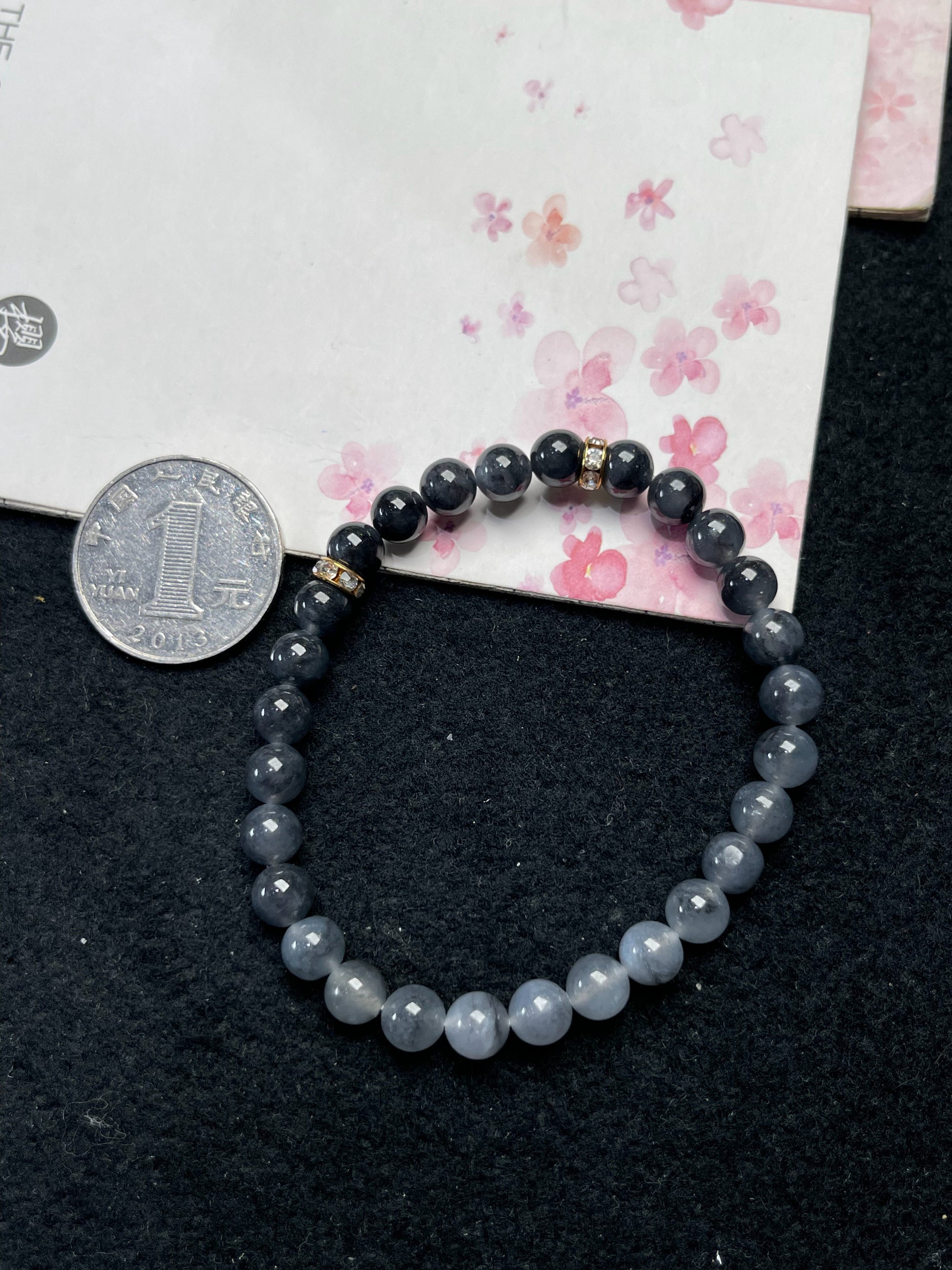 This refined bracelet is made from Natural Grade-A Burmese Jadeite of the Wu Ji (black jade) variety, showcasing a smooth gradient transition from misty gray-blue to deep charcoal black. Each bead is hand-polished to a glossy finish, revealing the fine texture and natural depth of jadeite.