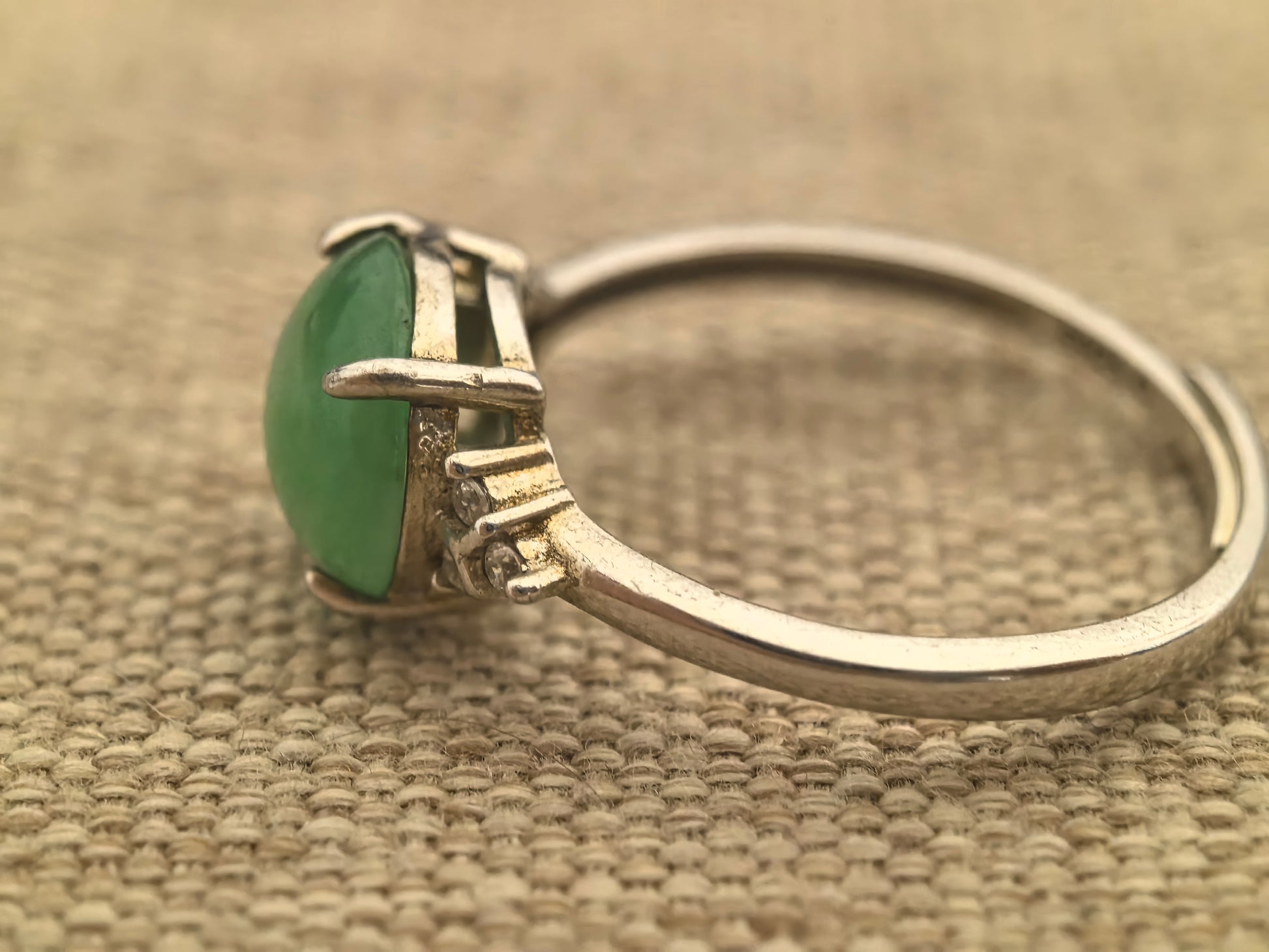 The slim silver shank keeps the ring light and comfortable for everyday wear, and the band can be opened slightly to fit a little larger. It’s an easy piece to throw on with casual outfits or to layer with other silver rings, and a great option if you want a real green jade ring at an accessible price.