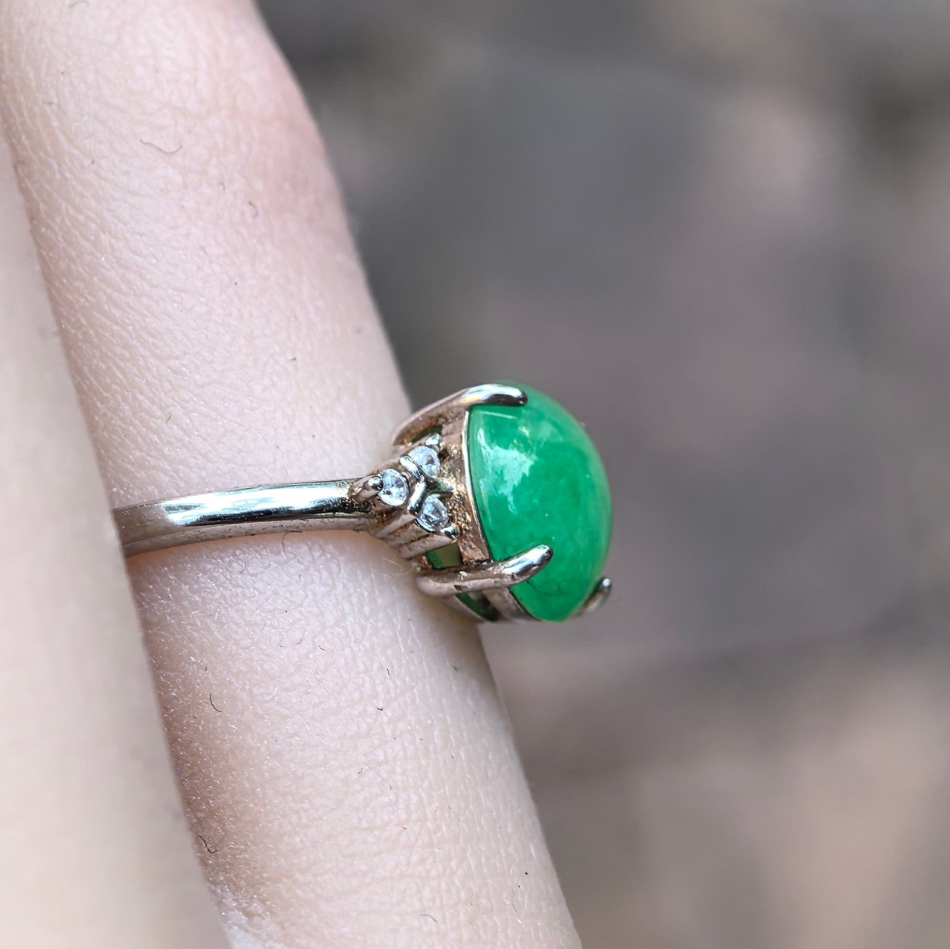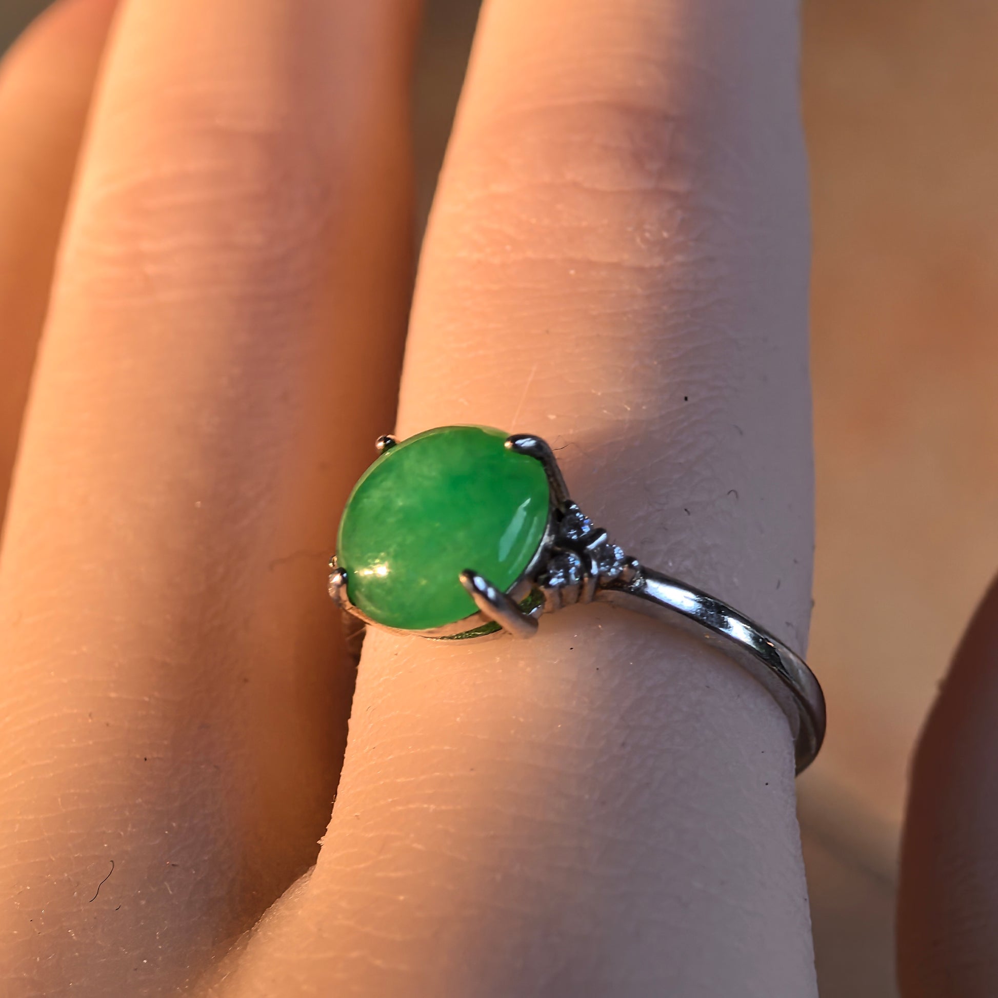 Natural Grade-A Silver-Set Glutinous Vivid Green Jadeite Cabochon Ring · Burmese Jade