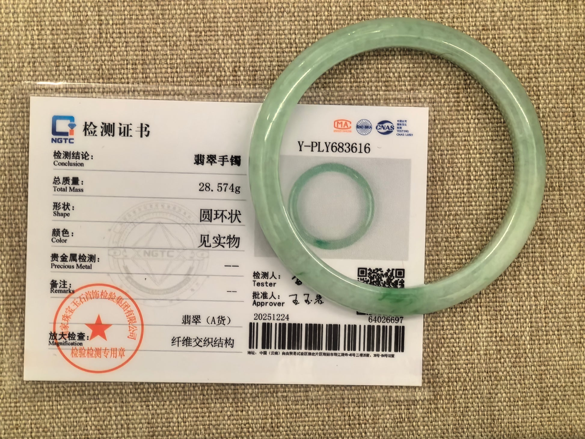 - Total weight: approximately 28.574 g, as marked on the original NGTC certificate for this bangle