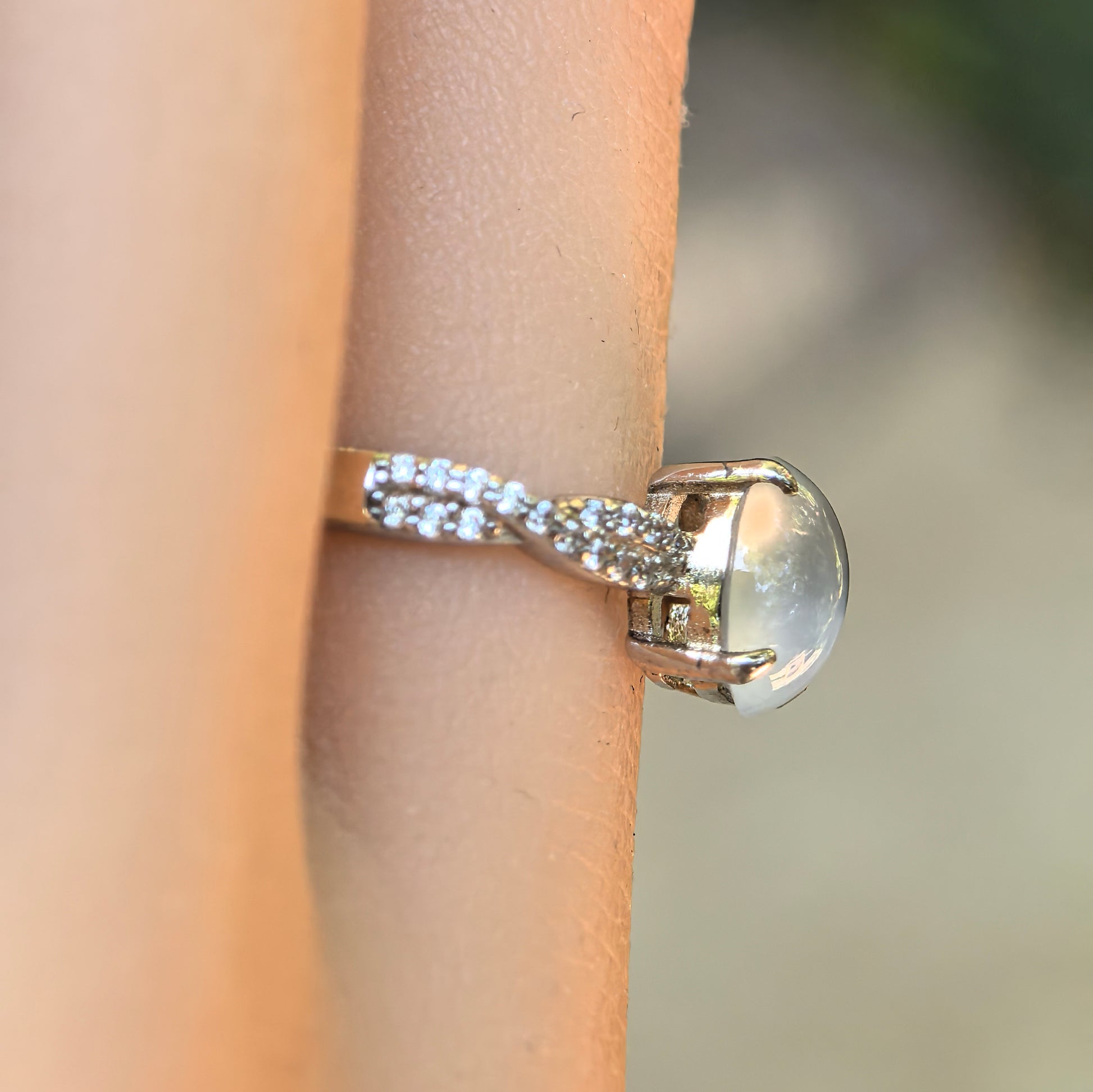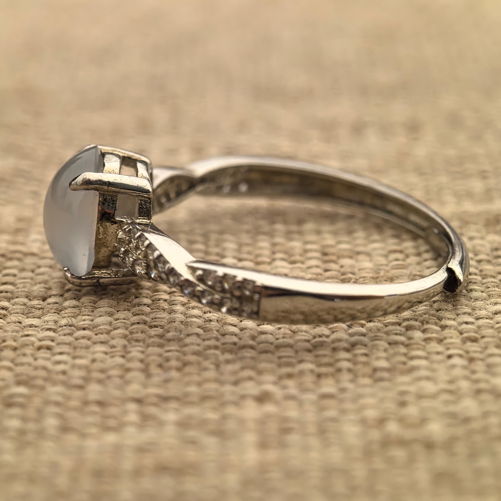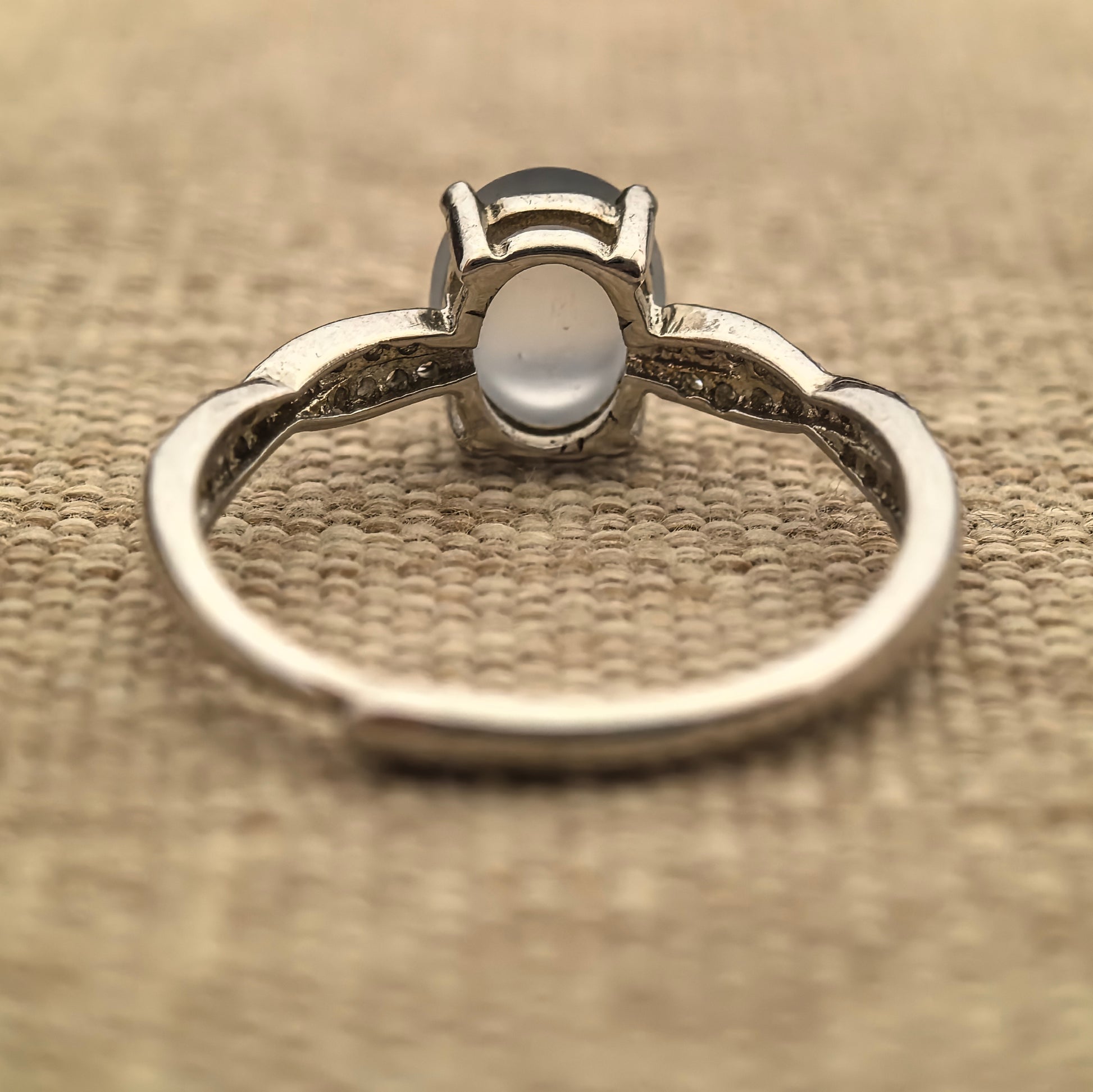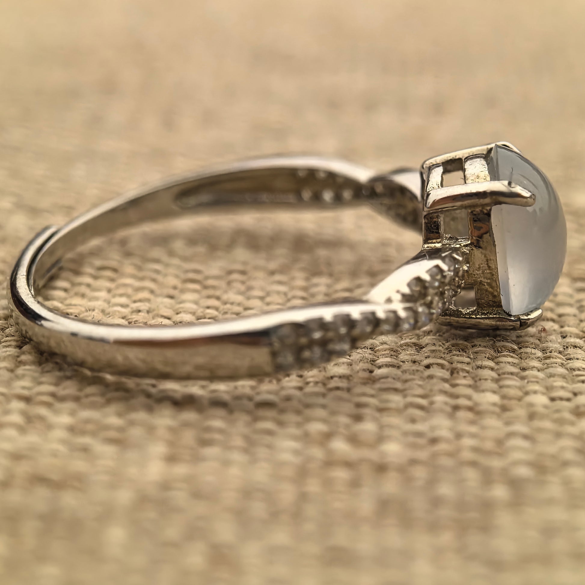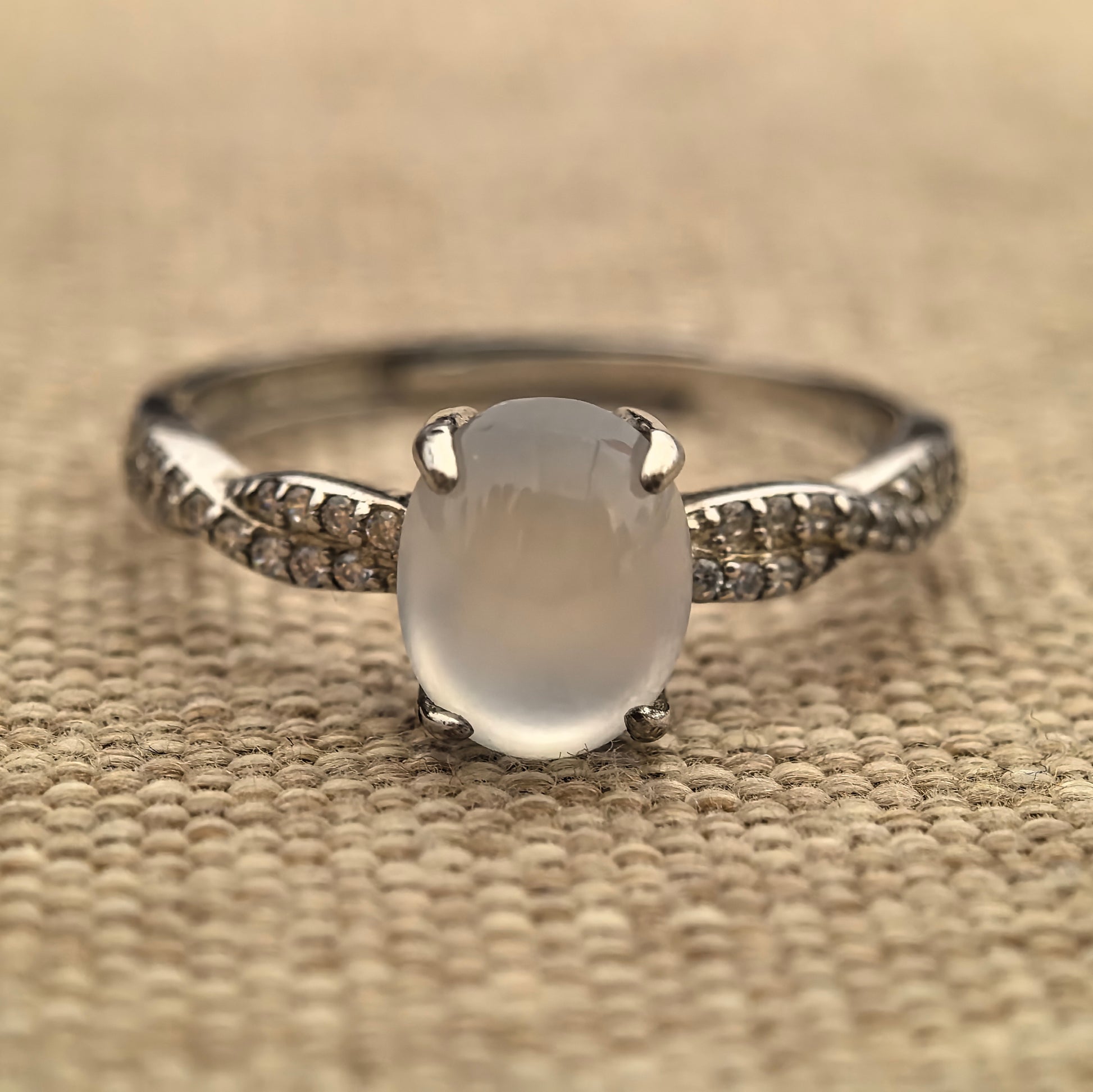 This ring features a high icy white jadeite cabochon in a clean oval shape, set in a bright silver frame with small accent stones on the shoulders. The colour is clear and fresh, giving a gentle glow on the hand rather than a harsh or overly shiny look.