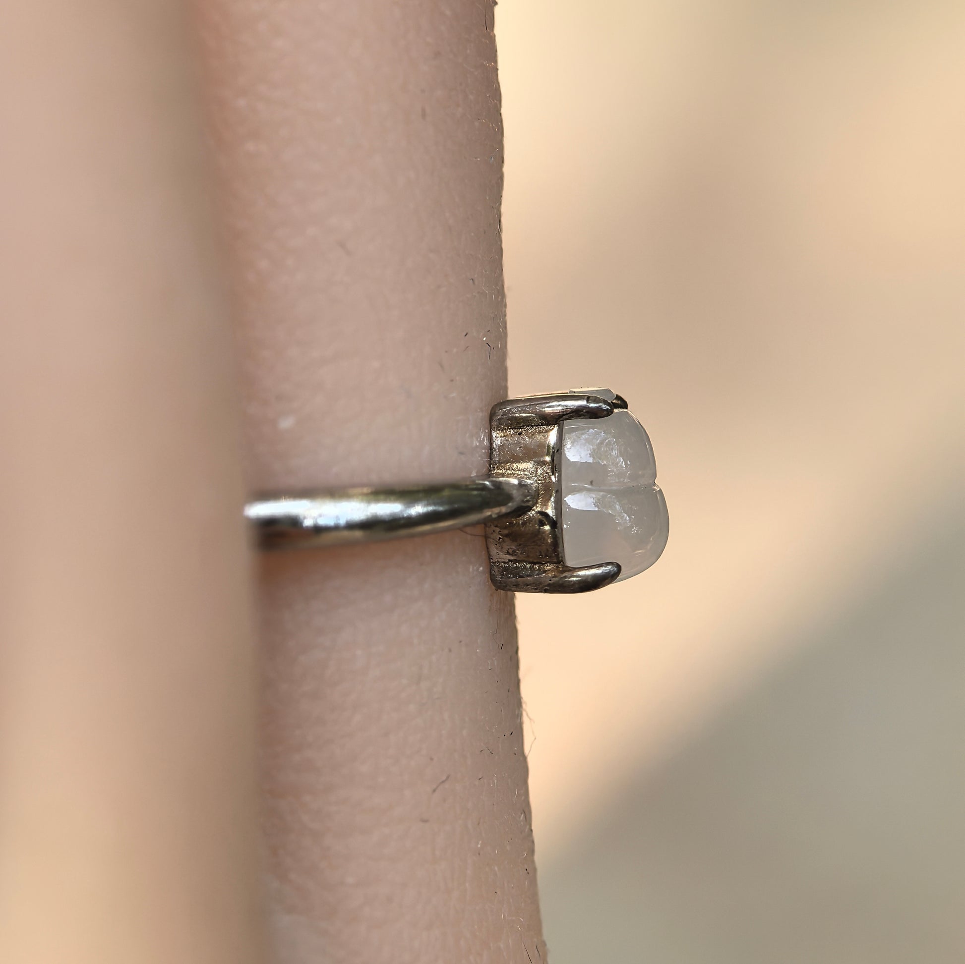 The Hulu carving is polished into a compact, rounded form, held securely by claw prongs that allow light to pass through the stone. The smooth silver band keeps the focus on the jadeite itself, making this piece easy to match with both casual outfits and more dressed-up looks.