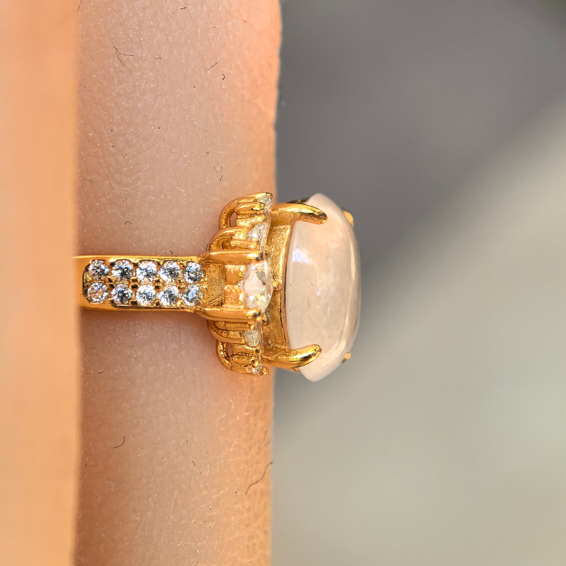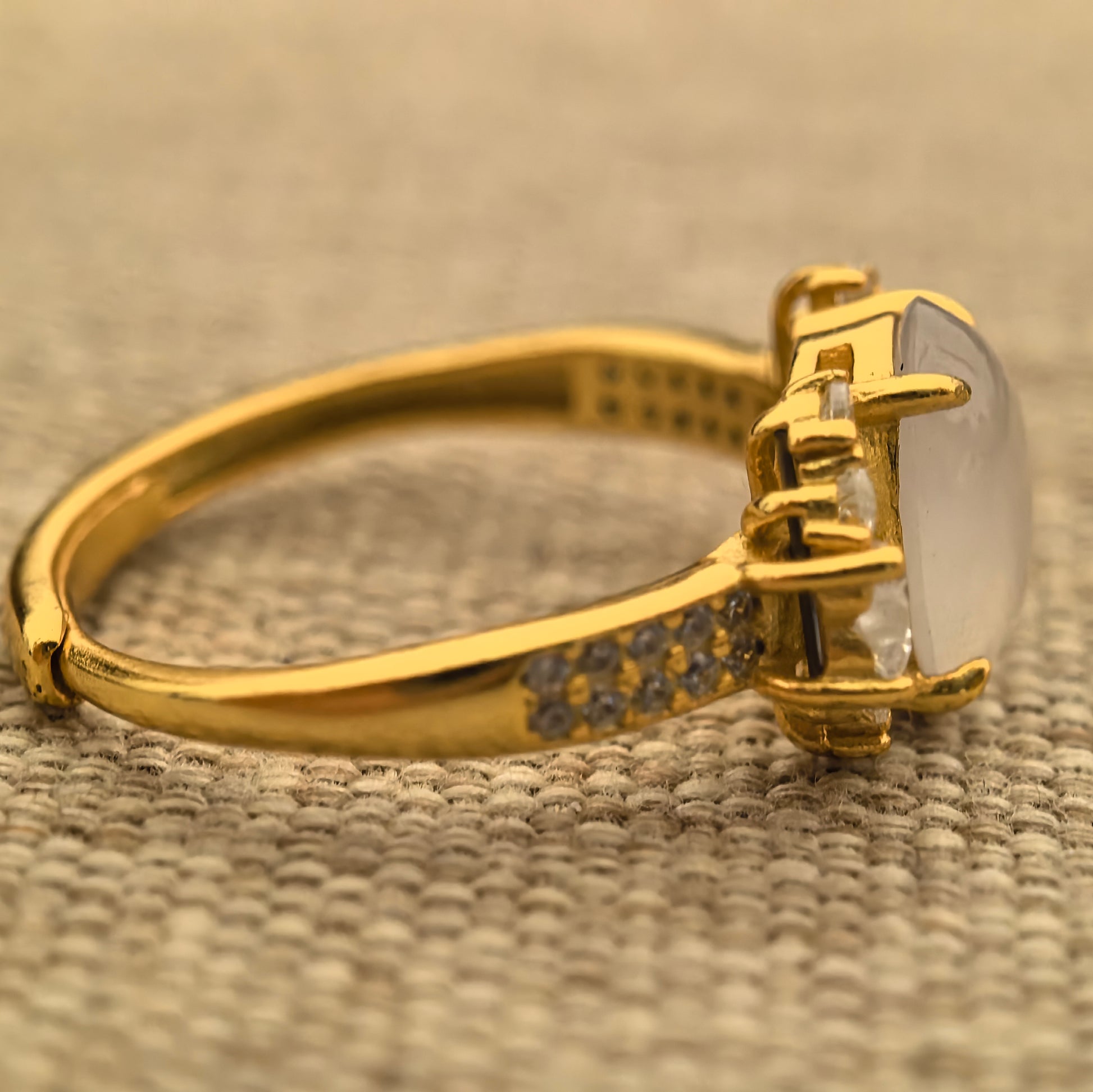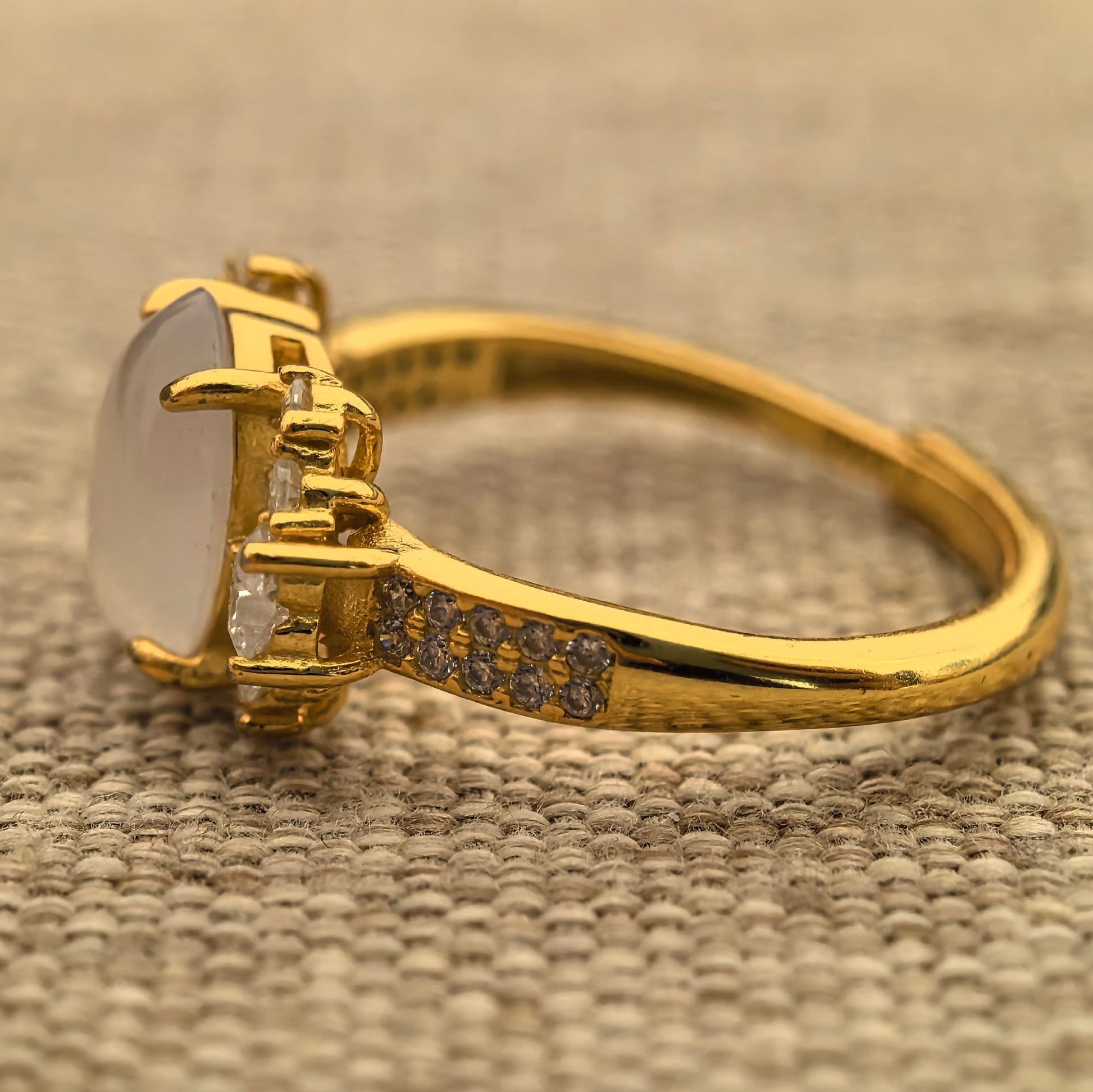 The jade is secured with sturdy prongs on a slim silver band, with sparkling pavé detailing that adds brightness without feeling too heavy. The band is an adjustable style designed around an inner diameter of about 17.8 mm and can be opened slightly larger, making sizing more forgiving and easier for gifting.