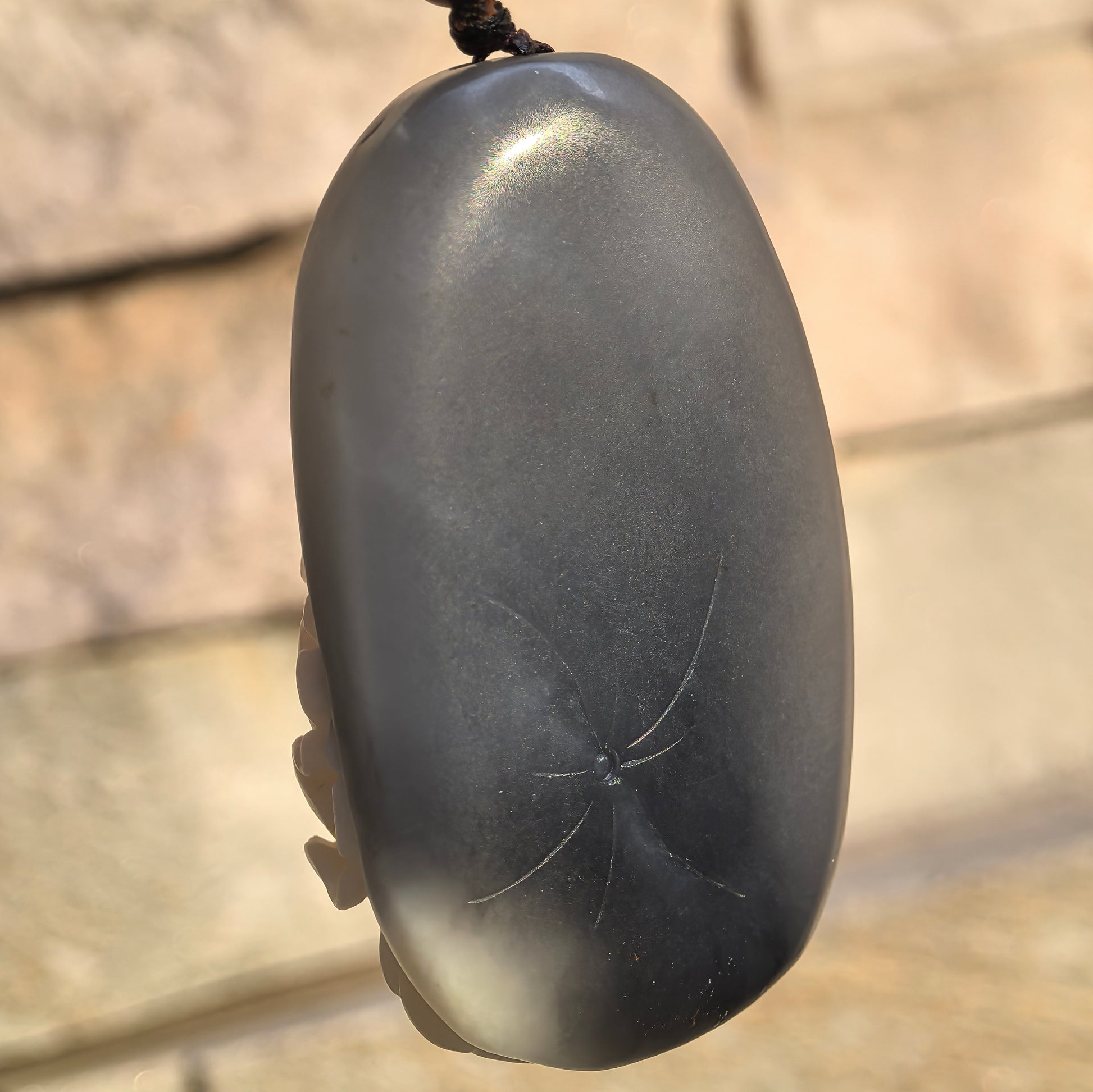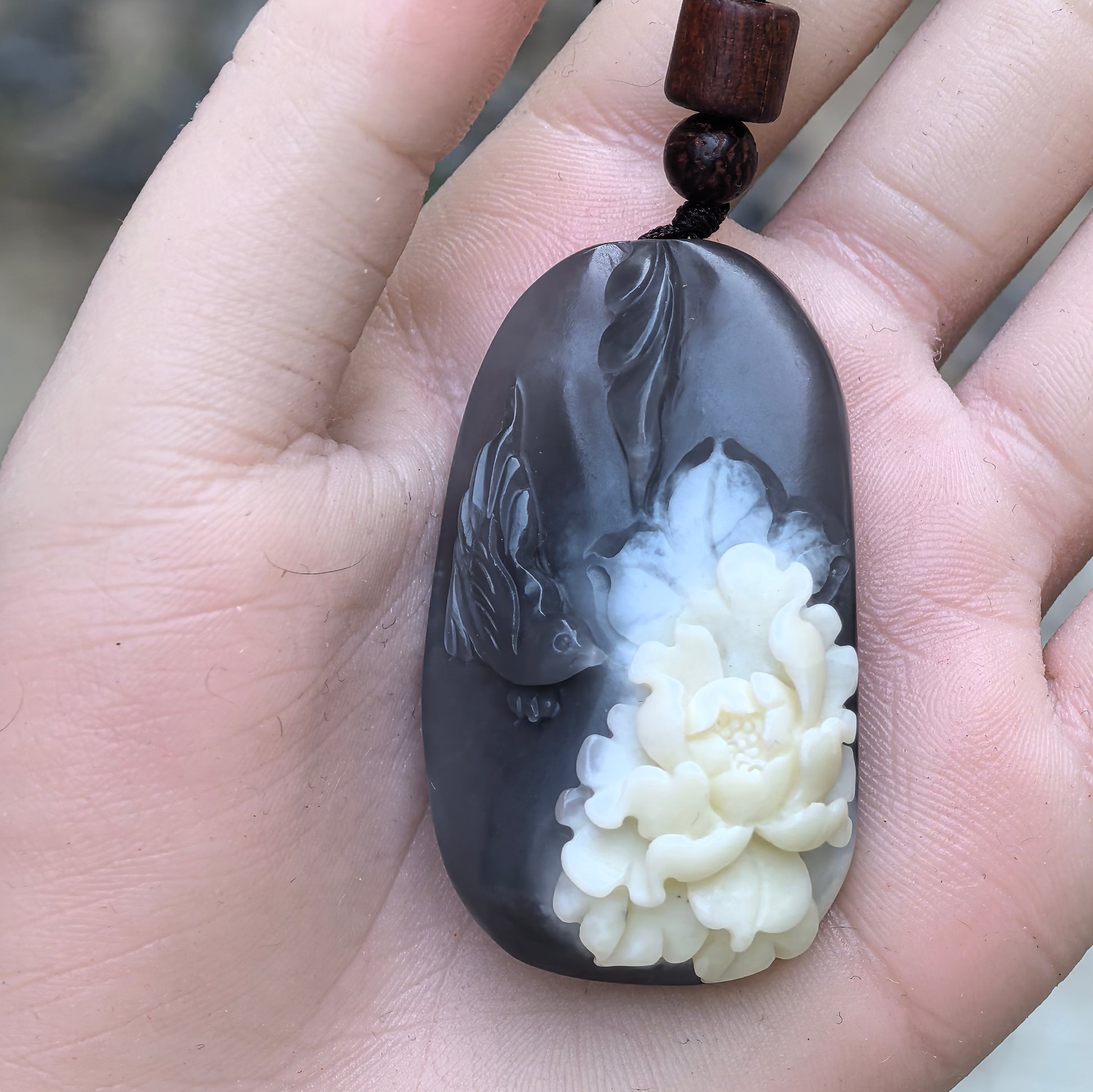 This pendant features a smoky purple Hetian jade carving with a striking “white bloom” flower relief. The overall tone sits between cool grey-purple and ink-smoke gradients, giving the piece a calm, high-end look that reads sophisticated rather than flashy.